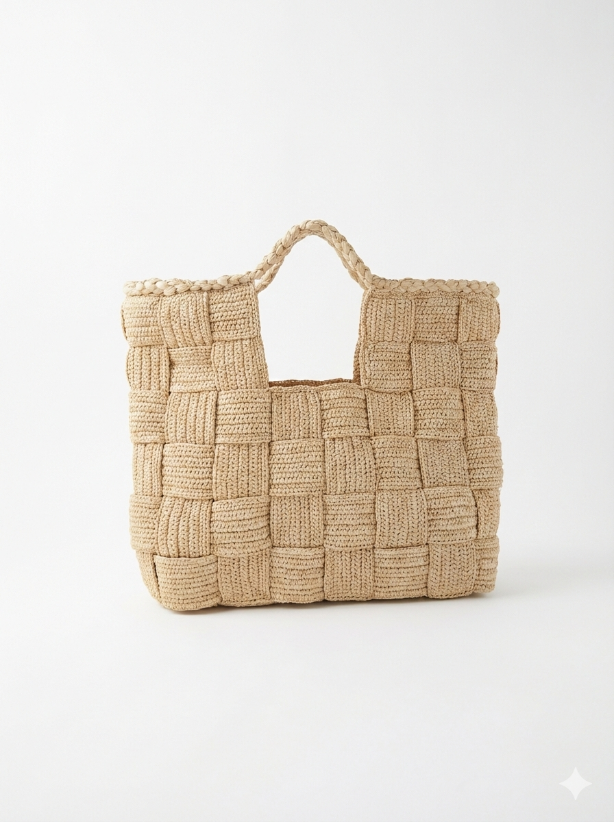 This handmade raffia crochet tote bag showcases a distinctive square woven pattern, carefully crafted from natural raffia fibers. Its structured yet flexible design highlights the beauty of artisanal crochet craftsmanship, offering both durability and visual texture.